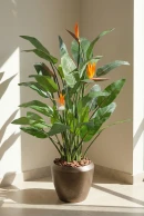 Infuse your space with tropical charm with our Flowering Bird of Paradise and sleek pot combination. Its uniquely shaped orange flower is sure to captivate attention, offering vibrant allure without the upkeep demands of live tropical plants.